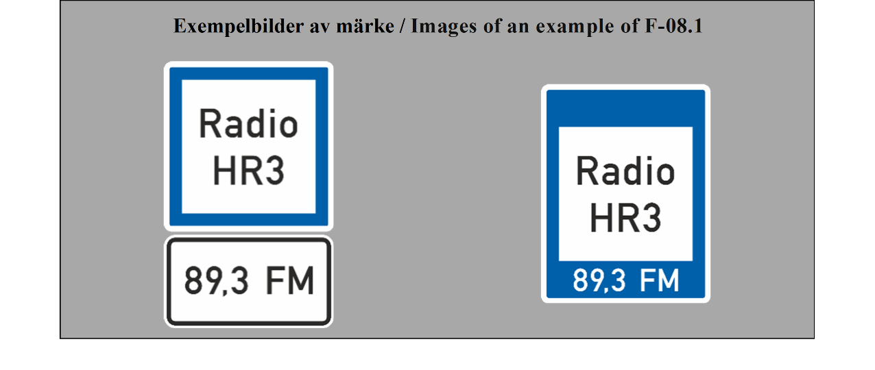 Skrift i en vit fyrkant: Ordet "radio" nedan kan följas av radiostationens namn eller symbol i en förkortad version och programmets nummer. Ordet "Radio" kan också upprepas på det nationella språket.