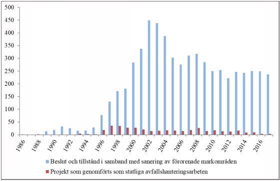 Figur 1. Det årliga antalet myndighetsbeslut i samband med iståndsättning av förorenade områden samt projekt som genomförts som statliga avfallshanteringsarbeten. Källa: SYKE 2018.
