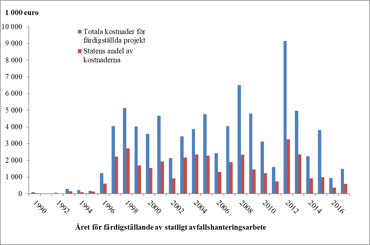 Såsom nämnts ovan har man via systemet för statliga avfallshanteringsarbeten finansierat saneringen av cirka 420 riskobjekt. De totala kostnaderna för undersöknings- och saneringsprojekten har varit cirka 77 miljoner euro, varav statens andel har varit cirka 35 miljoner euro. Årligen har cirka 8––15 nya saneringsprojekt påbörjats. Antalet projekt är litet jämfört med det totala antalet projekt för sanering av förorenade markområden (figur 2). Deras betydelse är dock större än deras relativa andel, eftersom saneringsåtgärderna i mån av möjlighet har inriktats på områden som bevisligen i sin nuvarande användning har orsakat betydande risk för hälsan eller miljön. Ofta har målet varit att säkerställa vattenkvaliteten i grundvattenområden som varit viktiga med hänsyn till vattenförsörjningen. I fråga om andra områden har iståndsättningen i regel gällt utveckling och byggande av området, varvid saneringsinsatserna närmast har varit ägnade att förebygga uppkomsten av hälsorisker i fortsättningen.