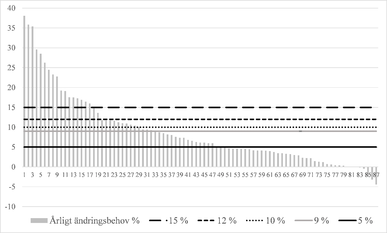 Det är svårt att bestämma en lägre gräns för den maximala höjningen än den nuvarande gränsen på 15 procent så att den inte blir problematisk med avseende på grundlagens egendomsskydd, eftersom nätinnehavarnas ekonomiska situation och finansieringsbehov varierar kraftigt. Dessutom har flera nätinnehavare på eget initiativ följt en försiktig tarifflinje, som har lett till att Energimyndigheten har fastställt stora underskott för dem under tidigare tillsynsperioder i förhållande till den tillåtna maximiavkastningen under tillsynsperioden. Vid beredningen av propositionen har man strävat efter att bedöma konsekvenserna av en sänkning av den övre gränsen för den maximala höjningen på basis av underskotten i den maximala tillåtna avkastning som nätinnehavarna fått under den tillsynsperiod som omfattade åren 2016–2019. Nätinnehavarna har under de kommande åren tid att anpassa sin verksamhet till en lägre övre gräns för den maximala höjningen än för närvarande, till skillnad från vad som gäller den tillsynsperiod som upphört. Avkastningen för dem som äger nätet beräknas också minska till följd av den sänkta ränta på kapital som ingår i de beräkningsmetoder som Energimyndigheten fastställt och de priser per enhet som används vid fastställandet av den intäktsbas som nättillgångarna utgör, så att konsekvenserna av minskningen sträcker sig åtminstone till den senare hälften av 2020-talet. Det bedöms därför att det finns ett spelrum för nedskärningar i framtida prishöjningar, men det är svårt att göra en exakt bedömning av detta.