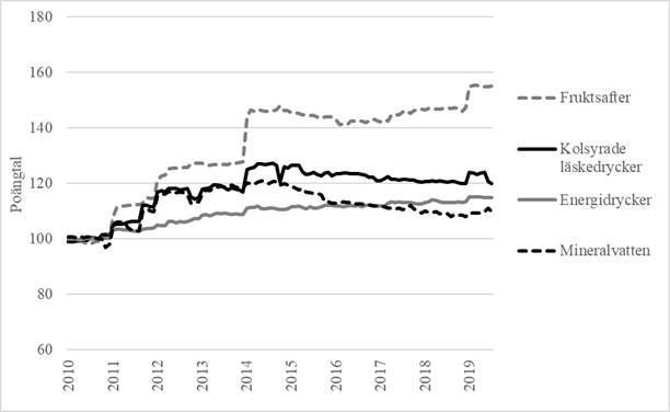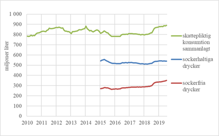 Sammanlagt ökar skattehöjningarna 2019 och 2020 skatten på sockerhaltiga drycker med 45 procent och skatten på sockerfria drycker med 18 procent. Den sammanlagda verkningen på dryckernas priser blir klart mindre, för sockerhaltiga drycker stannar den vid under sju procent och för sockerfria drycker vid under två procent.