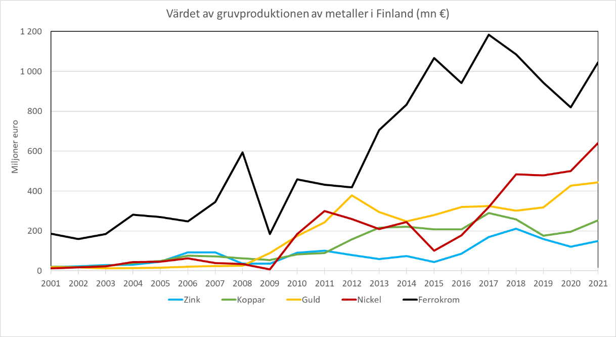 Figur 3 och 4. Värdet av metallmalmsgruvornas produktion enligt världsmarknadspriserna åren 2001–2021. Källa: Geologiska forskningscentralen.
