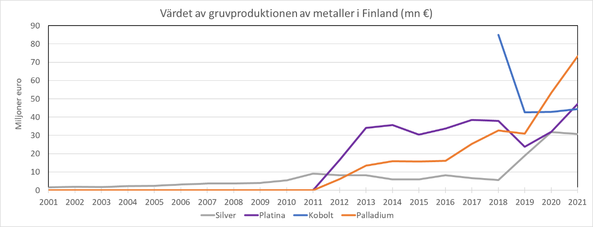 Värdet av den finländska gruvproduktionen varierar enligt mineralens värde, särskilt världsmarknadspriserna på metaller, och produktionsvolymen. Särskilt när det gäller metaller kan det kalkylerade värdet av gruvproduktionen efter anrikning, smältning och annan fortsatt förädling uppskattas utifrån världsmarknadspriserna. I så fall beskriver värdet av gruvproduktionen värdet av produktionen av förädlade gruvmineral, och egentligen inte värdet av de gruvmineral som har brutits ur marken. När det gäller värdet av den produktion som sker efter brytningen finns det inte några offentligt tillgängliga och jämförbara uppgifter. Utifrån halterna i de gruvmineral som har brutits och sänts för anrikning är det emellertid möjligt att uppskatta mängden metall som ingår i den brutna malmen.