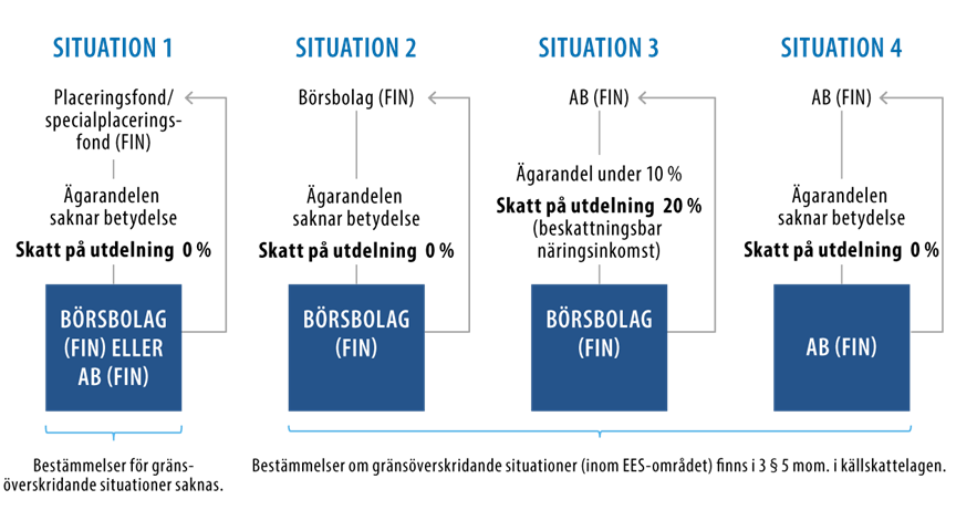 De vanligaste interna finska situationerna vid beskattning av utdelning och deras samband med beskattningen i gränsöverskridande situationer kan åskådliggöras med följande figur: