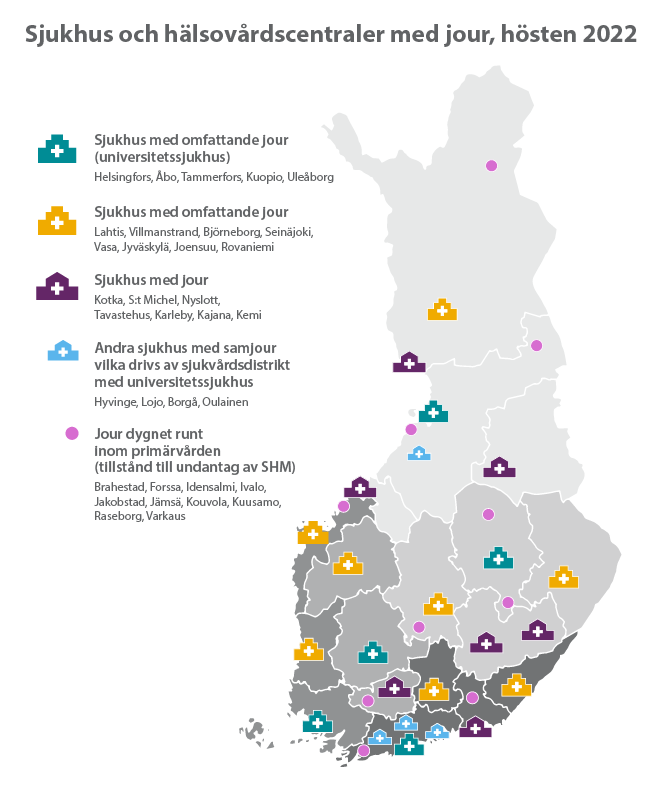 Hälso- och sjukvårdslagens 50 § innehåller bestämmelser om jour. I bestämmelserna föreskrivs det om ordnande av jour på olika nivå och i olika omfattning på det regionala planet. Jourbestämmelserna sågs över genom ett reformprojekt som ledde till att en lag om ändring av hälso- och sjukvårdslagen (1516/2016, RP 224/2016 rd) trädde i kraft den 1 januari 2017. Samtidigt ändrades bestämmelserna om centralisering av den specialiserade sjukvården. I och med reformen föreskrevs det att det i Finland ska finnas 12 enheter med omfattande jour dygnet runt. Vid de övriga centralsjukhusen ordnas samjour dygnet runt för primärvården och den specialiserade sjukvården, vilket omfattar jour dygnet runt inom de specialområden som oftast behövs. I hälso- och sjukvårdslagens jourbestämmelser gjordes dessutom ytterligare en ändring som trädde i kraft vid ingången av 2020, då Vasa sjukvårdsdistrikt med stöd av regeringsprogrammet ålades en skyldighet att ordna en enhet med omfattande jour dygnet runt i anslutning till sitt centralsjukhus (lagen om ändring av hälso- och sjukvårdslagen, 1214/2019, RP 38/2019 rd). Nu finns det alltså 13 enheter med omfattande jour dygnet runt, av vilka fem är universitetssjukhus som ger den mest krävande vården.