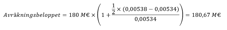 Anta att avräkningsbeloppet utan att förändringen i befolkningsandelen beaktas är 180 miljoner euro och Ålands befolkningsandel är 0,534 procent år t och 0,538 procent år t+1, då skulle avräkningsbeloppet år t+1 vara följande: