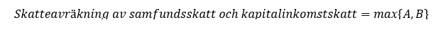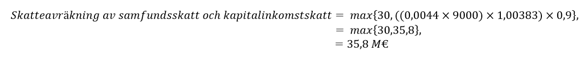 där A är det i 1 mom. avsedda samfundsskattens och kapitalinkomstskattens sammanlagda belopp och B är ((avräkningsgrunden * (samfundsskatt + kapitalinkomstskatt)) * koefficient för befolkningsförändring)* 0,9.