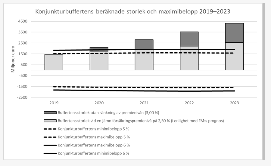 Till 2 mom. föreslås det dessutom att det fogas en mening enligt vilken maximibeloppet för buffertens skuld dock kan vara 300 miljoner euro större än det belopp som motsvarar utgifterna för en arbetslöshetsgrad på 6,0 procentenheter. Genom tillägget blir det möjligt att för utjämning av premienivån använda en konjunkturbuffert som uppvisar skuld i samma utsträckning som när bufferten uppvisar ett överskott.