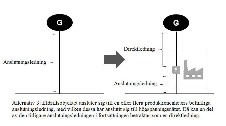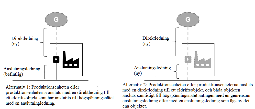 Inom ramen för de nuvarande bestämmelserna är det möjligt att bilda en energisammanslutning som överskrider fastighetsgränserna genom en direktlinje. Enligt 3 § 5 a-punkten i elmarknadslagen avses med direktledning en elledning som ansluter en separat produktionsenhet till en separat kund och en elledning som ansluter en producent och en elleverantör till deras egna lokaler, dotterföretag eller kunder för direkt elleverans. Definitionen motsvarar definitionen i artikel 2.41 i elmarknadsdirektivet. Enligt 13 § 2 a-punkten i elmarknadslagen kan någon annan än distributionsnätsinnehavaren inom distributionsnätsinnehavarens ansvarsområde bygga en direktledning genom vilken småskalig elproduktion ansluts till ett eldriftsställe eller till en fastighets eller motsvarande fastighetsgrupps nät. Med hjälp av de nationella bestämmelserna om direktledningar har man strävat efter att främja utnyttjandet av småskalig förnybar elproduktion. Med småskalig elproduktion avses i elmarknadslagen ett kraftverk eller en helhet som utgörs av flera kraftverk med en effekt på högst två megavoltampere.
