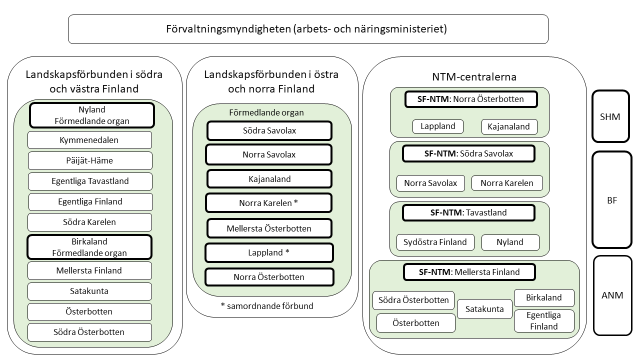 Enligt 1 mom. är förmedlande organ närings-, trafik- och miljöcentralerna, Livsmedelsverket och landskapsförbunden. Den förvaltande myndigheten kan med stöd av artikel 65.3 i den allmänna förordningen utse landskapsförbunden, närings-, trafik- och miljöcentralerna och Livsmedelsverket att utföra en del av den förvaltande myndighetens uppgifter på den förvaltande myndighetens ansvar om kraven i den allmänna förordningen och i synnerhet i förordningens bilaga X uppfylls. Den förvaltande myndigheten följer upp att kraven uppfylls. För denna uppgift ges den förvaltande myndigheten på det sätt som framkommer av 11 § behörighet att exempelvis ålägga det förmedlande organet att vidta åtgärder.