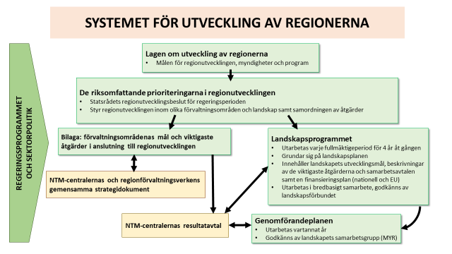 På nationell nivå samarbetar de centrala ministerier som deltar i regionutvecklingen koordinerade av arbets- och näringsministeriet. Bestämmelser om uppgiften finns i 21 § 3 punkten i reglementet för statsrådet (262/2003). Det föreskrivs mer ingående om ministeriets regionutvecklingsuppgifter och samarbetspartner i 9 § i förslaget. På regional nivå fungerar de samkommuner, dvs. landskapsförbunden, som kommunerna bildat som regionutvecklingsmyndigheter. Om deras uppgifter i fråga om regionutveckling och centrala aktörer för samarbetet föreskrivs i 17 §.