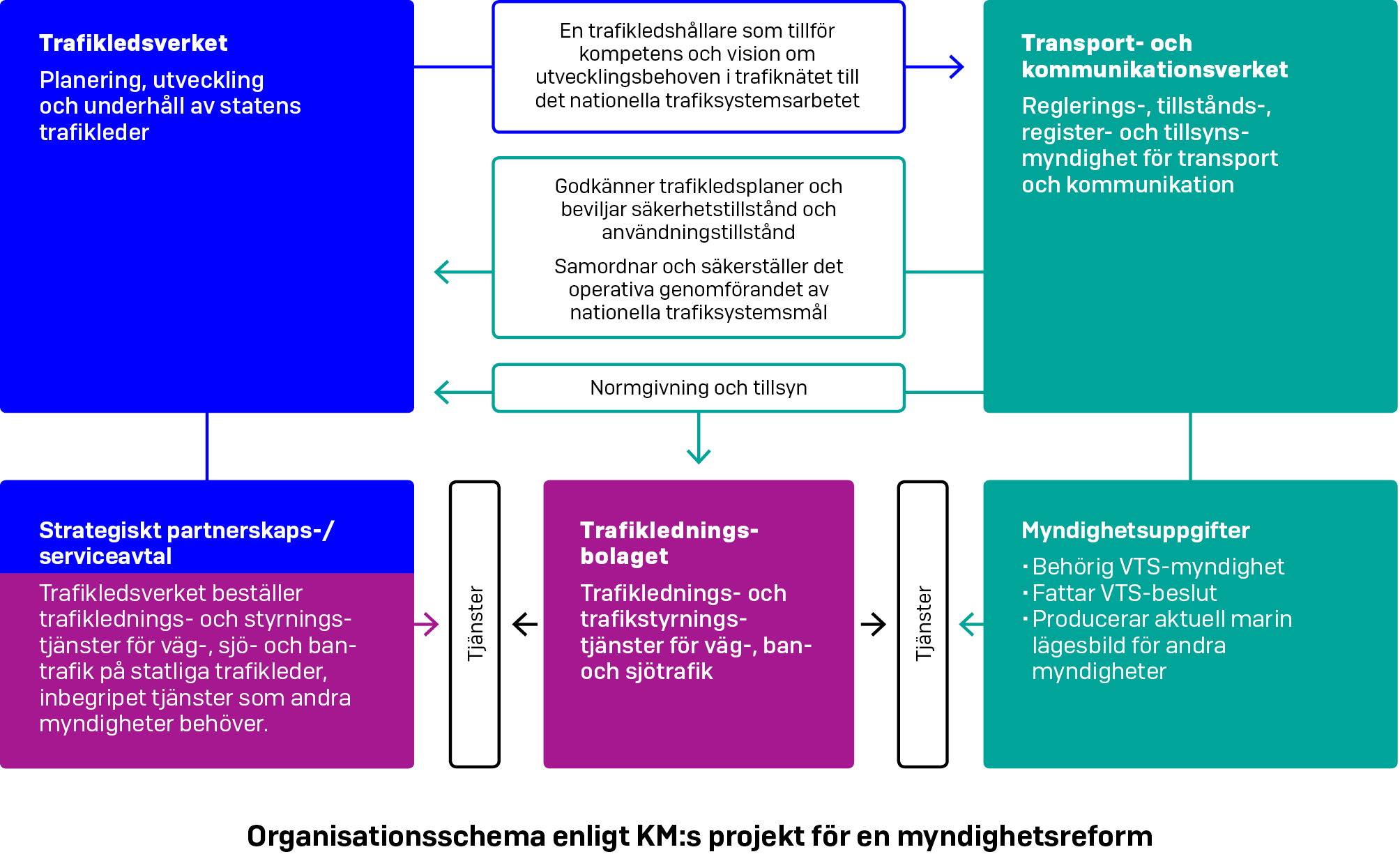 Transport- och kommunikationsverket övertar tillsynen över farledshållarna av Trafikverket. I uppgiften ingår att meddela föreskrifter om trafikanordningar, inklusive sjötrafikmärken och säkerhetsanordningar för sjöfarten. I uppgiften ingår också att bevilja tillstånd att placera ut säkerhetsanordningar för sjöfarten, farledsbeslut, att fatta beslut och meddela anvisningar om förbud och begränsningar som gäller farleder samt att meddela föreskrifter om styrning av sjötrafiken. Ett farledsbeslut är ett administrativt myndighetsbeslut, genom vilket det fastställs att de farleder och säkerhetsanordningar som nämns i beslutet har tagits i bruk officiellt.