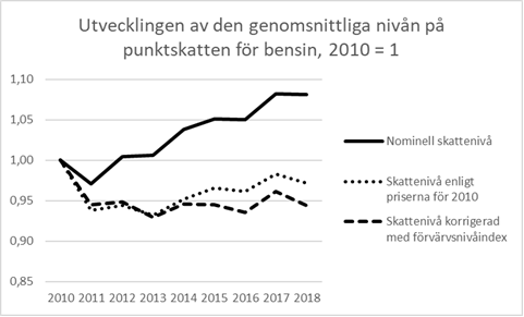 Trots att de nominella punktskattenivåerna för drivmedel har stigit har inte heller den reella punktskattenivån för bensin stigit på 2010-talet, eftersom konsumentpriserna och hushållens disponibla inkomster har ökat mer än den genomsnittliga punktskattenivån. År 2018 var punktskattenivån för bensin deflaterad med konsumentprisindex ca tre procent lägre och deflaterad med förtjänstnivåindex ca fem procent lägre än år 2010.