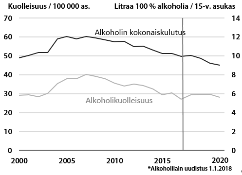 Enligt bilaga 1 i Institutet för hälsa och välfärds utlåtande (Institutet för hälsa och välfärd/4160/4.00.00/2023) minskade dödligheten i alkoholrelaterade sjukdomar och alkoholförgiftningar ganska kraftigt åren 2007–2017, men den positiva utvecklingen stannade av och alkoholdödligheten ökade något när alkohollagen trädde i kraft 2018. Då ökade alkoholdödligheten mer än man kunde ha antagit på basis av förändringen i den totala konsumtionen. Enligt THL tyder detta på att de som använder mycket alkohol, som kanske redan hade orsakats t.ex. leverskador, ökade sin konsumtion av alkoholdrycker mer än andra konsumenter.