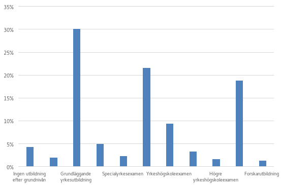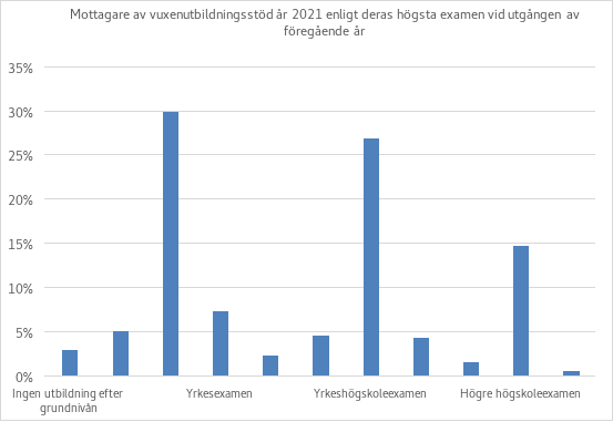 Den tidigare utbildningen bland stödtagarna 2021 presenteras i figuren nedan. Andelen högskoleutbildade är högre bland mottagarna av vuxenutbildningsstöd än bland sysselsatta i genomsnitt. Enligt sysselsättningsstatistiken var andelen som avlagt en examen på högre nivå 47 % bland de sysselsatta som var i åldern 25–64 år och 50 % bland de sysselsatta som var i åldern 35–54 år år 2021. Motsvarande siffror för hela befolkningen (inbegripet andra än sysselsatta) var 42 % respektive 45 % bland 25–64-åringar och 35–54-åringar.