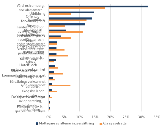 En branschspecifik granskning av stödet visar att användningen är koncentrerad särskilt till social- och hälsovårdsbranschen (figur 2), som år 2021 utgjorde 19 procent av de sysselsatta och 36 procent av stödtagarna. Stöd används i mindre utsträckning än genomsnittet särskilt inom primärproduktion, industri och byggbranschen. Skillnaderna mellan branscherna syns också på sektornivå, vilket betyder att det år 2021 var relativt vanligast att stödet användes inom kommunsektorn (22 % av de sysselsatta, 36 % av stödtagarna). Det förekommer inga stora skillnader i användningen av vuxenutbildningsstöd mellan de olika landskapen.
