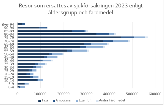Resor som ersätts av sjukförsäkringen 2023 enligt åldersgrupp och färdmedel. Källa: Folkpensionsanstalten.